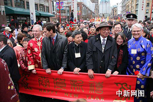 隨著震天的鑼鼓聲、鞭炮聲、大人小孩歡樂的笑聲,“財神爺”身著大紅袍,頭戴金盔,手舉護(hù)身旗走在游行隊伍最前面。在南腔北調(diào)的“恭喜發(fā)財”聲中,新上任不久的卑詩省省督波因特沿途向民眾大派“利是”;加拿大最大反對黨聯(lián)邦自由黨黨領(lǐng)狄安身穿紅色唐裝,頻頻拱手賀禧;中國駐溫哥華總領(lǐng)事楊強,卑詩省省長金寶爾和溫哥華市長蘇利文等加國三級政要并排而行,拉著寫滿新春祝福的橫幅,與民眾共慶戊子鼠年新春。