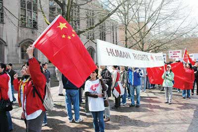 一些示威者認(rèn)為,達(dá)賴是最近西藏暴亂的黑手,目的在反對中國50多年的統(tǒng)治。有些標(biāo)語寫著“達(dá)賴是騙子及美國中情局資助的好戰(zhàn)分子”。很多示威者不斷揮舞巨型中國國旗。