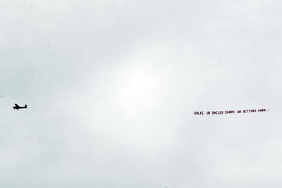 此外,在此前13日達(dá)賴?yán)锍鱿奈餮艌D萬人集會上,有華人租用飛機(jī),拉出“達(dá)賴停止支持暴亂”(Dalai: stop supporting Riots)的標(biāo)語,在空中繞場不斷飛行,讓達(dá)賴抬頭看到。