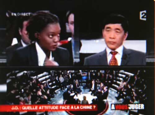 先看一看曲星公使面對的陣勢:政府人權(quán)事務(wù)國務(wù)秘書拉瑪·亞德、前社會黨總理法比、主張抵制北京奧運(yùn)會的田徑運(yùn)動員協(xié)會代表和對中國抱有極深偏見的《解放報(bào)》主編約弗蘭,再加上操縱輿論的主持人:以一敵五。4月7日法國5臺辯論節(jié)目《巴黎無圣火》上,鄭若麟一人面對四人,董純4月13日在《報(bào)亭》參加的辯論會上共有一名主持人和五名外國駐法記者,而站在公正立場上的只有一位非洲記者,等于也是一對四。從一開始,他們就處在這樣的陣勢中。