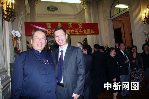 是晚的中國駐法使館內(nèi)張燈結(jié)彩,一派喜氣;走廊里布置的北京國家體育場——鳥巢掩映在璀璨的禮花中,分外奪目;旅法華人社團向祖(籍)國祝賀生日的花籃從使館大門口排到了二樓。身著中式禮服的中國駐法大使與僑胞們同賀祖(籍)國59華誕。