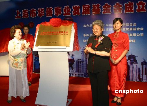 九月十八日晚,“上海市華僑事業(yè)發(fā)展基金會(huì)”在上海舉行成立儀式,全國(guó)政協(xié)港澳臺(tái)僑委員會(huì)副主任唐聞生與美國(guó)國(guó)際合作委員會(huì)主席陳香梅女士(左)為該基金會(huì)揭牌。與此同時(shí),該基金會(huì)網(wǎng)站開(kāi)通。中新社發(fā) 潘索菲 攝