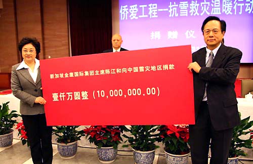 1月中旬以來,中國南方大部分地區(qū)遭遇五十年不遇的低溫、雨雪和冰凍天氣,造成7786.2萬人受災(zāi),直接經(jīng)濟(jì)損失220.9億元。在這種情況下,新成立的中國僑商投資企業(yè)協(xié)會響應(yīng)國務(wù)院僑辦發(fā)起的“僑愛溫暖行動”,向廣大僑商發(fā)起“抗雪救災(zāi),溫暖行動”的緊急倡議書。中國僑商投資企業(yè)協(xié)會常務(wù)副會長、新加坡金鷹國際集團(tuán)主席陳江和先生聞訊第一個(gè)響應(yīng),捐贈1000萬元人民幣用于抗災(zāi)。