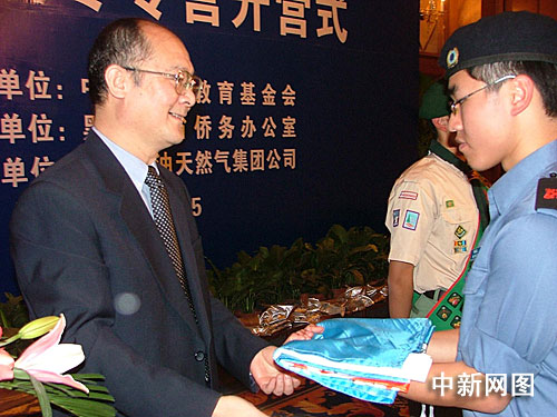國(guó)僑辦副主任趙陽(yáng)向冬令營(yíng)營(yíng)員代表授營(yíng)旗。