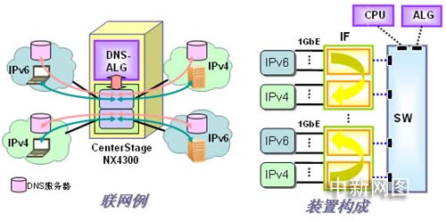 可以在ALG 刀片上搭載將DNS咨詢(xún)進(jìn)行IPv6-IPv4轉(zhuǎn)換的ALG功能。與轉(zhuǎn)換服務(wù)器刀片協(xié)作可以實(shí)現(xiàn)IPv6與IPv4的雙方向通信。