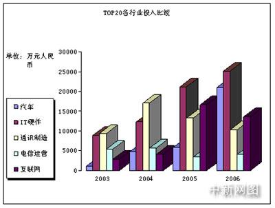 現(xiàn)在的情況是怎么樣呢?整個中國市場的網(wǎng)絡(luò)廣告投放額在增加,但以前那種一家獨大的情況不見了。更多的企業(yè)主體參與進來了。從下面的網(wǎng)絡(luò)廣告TOP20各行業(yè)投入比較表中可以看到,在2006年,汽車已經(jīng)超越了互聯(lián)網(wǎng)企業(yè),成為對網(wǎng)絡(luò)廣告貢獻比例最大的行業(yè)之一,僅僅次于IT硬件產(chǎn)業(yè)。