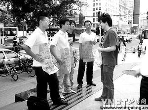 8月26日,在中關(guān)村核心區(qū)的銀科大廈附近,4名男子手舉寫(xiě)著“出售網(wǎng)站、網(wǎng)站維護(hù)、網(wǎng)站推廣”等內(nèi)容的紙牌子站成一排,這一場(chǎng)景被拍下照片上傳到網(wǎng)絡(luò)后引起了網(wǎng)友的關(guān)注,有人稱(chēng)他們是策劃炒作。昨天,這一活動(dòng)的主導(dǎo)者張濤稱(chēng)此一舉動(dòng)純粹是偶然的,只是為了賣(mài)掉12個(gè)不賺錢(qián)的小網(wǎng)站,沒(méi)有炒作的意圖,他沒(méi)想到引起了這么多人關(guān)注。