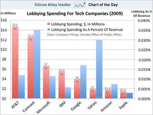 有趣的是,圖表顯示蘋果公司在游說(shuō)方面的花費(fèi)最少,可能與它沒有市場(chǎng)壟斷有關(guān)。