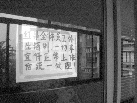 門上貼著一張告示,“紅果全體員工外出培訓(xùn),一切事宜待正常上班后統(tǒng)一處理”。記者透過玻璃看到,該公司的辦公用品還在。