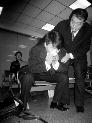 黃靜的代理人周成宇和代理律師付占平一起來到朝陽法院,向法院遞交向華碩討名譽(yù)權(quán)索賠100萬的立案申請(qǐng),在排號(hào)機(jī)上取號(hào)后,周成宇與律師進(jìn)入受理大廳等候。就在眾人等待之時(shí),剛才還在與律師交談的周成宇突然口噴鮮血,令大廳內(nèi)的人吃驚不已。有記者遞給周成宇紙巾,擦拭嘴上的血跡,在律師的攙扶下,周成宇坐下,幾次又出現(xiàn)嘔血的狀況。雖然他一直稱沒事,拒絕叫急救車,但臉色蒼白,拿著紙巾的手也不住地顫抖。