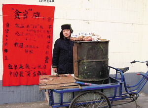 從“水冰月”所發(fā)的照片可以看到,賣紅薯者是一名年約30歲的男子,身穿深色皮襖,頭戴一頂雷峰帽,在一輛三輪車上放著一個(gè)由汽油桶改裝的烤爐。在烤爐上面,擺放著多個(gè)烤好的紅薯。另外,在其中的3個(gè)紅薯上面還分別插了牌子,分別寫著“和珅”、“秦檜”和“謝X龍”。