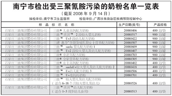 截至9月14日,南寧市衛(wèi)生監(jiān)督所共抽取了36份三鹿牌各類奶粉送自治區(qū)疾病預防控制中心檢驗。已出結(jié)果的25份樣品檢驗報告單表明,有14份樣品檢出了三聚氰胺。在這14份樣品中,9份是各階段的嬰幼兒配方奶粉,5份是成人適用奶粉,其中包含有準媽媽奶粉、孕期及哺乳期女士營養(yǎng)配方以及中老年配方等(詳見列表)。