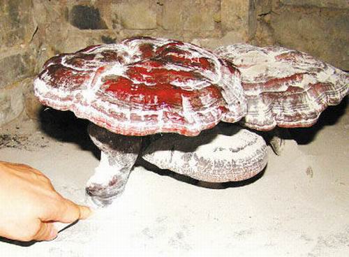 赤靈芝民間稱靈芝草。多孔菌科,是一種藥用真菌。外形頗似一株五彩蘑菇,“蘑菇蓋”呈不規(guī)則云朵形,有環(huán)紋與輻射狀的皺紋相穿插;“蓋”的下面有眾多的細(xì)密菌管孔洞;梗側(cè)生于“蓋”下,光澤如漆。每逢夏季,泰山氣溫漸高,林間相對濕度逐漸增大,陽光散射,形成泰山靈芝迅速生長的有利條件。秋末,可在柞、楓朽木樁旁采到。全株入藥,有治耳聾、利關(guān)節(jié)、保神、益精氣、堅盤骨、療虛勞、滋補強壯等功能。(徐庶)