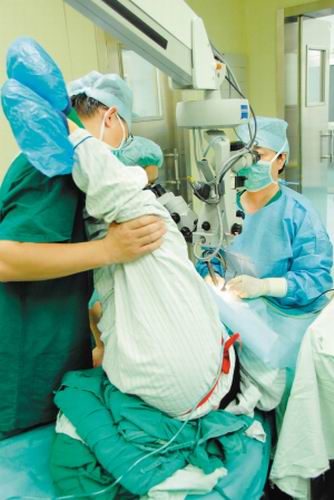 考慮到病人身體的特殊情況,手術(shù)中,醫(yī)生只能始終扛著她的雙腿,并將臀部抬起,才能實(shí)施。但是由于拆除白內(nèi)障是十分精密的手術(shù),全過程都要在顯微鏡下進(jìn)行,負(fù)責(zé)扛腿的醫(yī)生只要使患者身體有一絲抖動(dòng),不僅會(huì)使手術(shù)失敗,還可能造成眼球破損,導(dǎo)致終身失明。為此,他們特意安排了多名身體強(qiáng)壯的醫(yī)生,輪流扛著患者腿部。