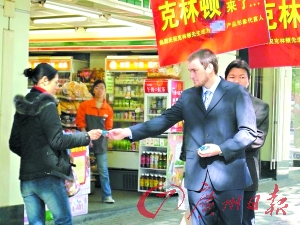 昨日,一位名叫“克林頓”的人在東莞街頭給消費者免費派發(fā)其代言的安全套(見上圖)。不過,這位“克林頓”可不是前美國總統(tǒng)比爾·克林頓,而叫威廉·比利·克林頓,加拿大人。對于商家的宣傳手法,有市民質(zhì)疑這是借美國前總統(tǒng)克林頓的名字來制造噱頭。(記者 周偉涵 通訊員 黃菲 攝)