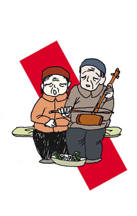 ☆吉利話扭倒費(fèi) 身強(qiáng)體健的中年壯漢也有自己的乞討之道:在開門營(yíng)業(yè)的攤點(diǎn)前耍獅子、打快板、送財(cái)神,不給錢就不走人,磨到你給錢為止。