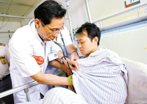 會(huì)診完畢,鐘南山專門到災(zāi)區(qū)傷員所在的愛心病區(qū)進(jìn)行探望。左腿骨折的22歲傷員王濤的心率偏快,鐘南山特地掏出聽診器,在他的病床前俯身為他進(jìn)行檢查,一邊詢問這個(gè)靦腆的年輕人:“在四川住院住了多久?到廣州第幾天了?”