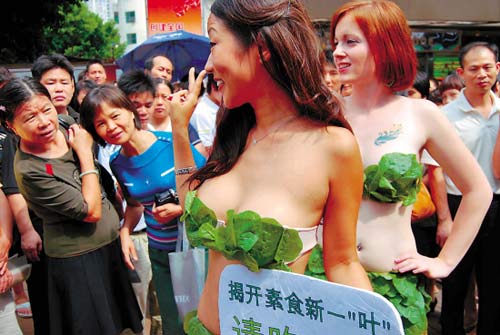 昨天下午2時,北京路商業(yè)步行街,兩位自稱來自善待動物組織的外國女孩僅用菜葉擋住身體關(guān)鍵部位,大方招搖過市。但見兩位“夏娃”一路高舉標(biāo)語牌,大聲用生硬中文高喊“請吃素吧”。據(jù)了解,這兩位性感女郎來自韓國和加拿大。