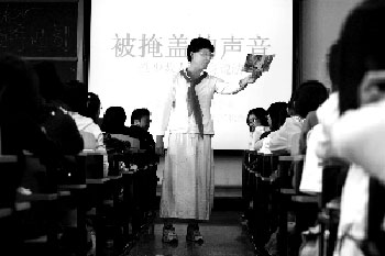 11日下午,易裝戀者曹靖身著白裙向?qū)W生們“講課”。本報記者 浦峰 攝