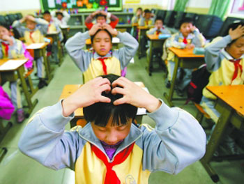 十一長假過后,西四北四條小學(xué)的學(xué)生就開始學(xué)做新版眼保健操了。多數(shù)老師都認(rèn)為新版眼保健操動作簡單易學(xué),而且增加了腳趾活動和按壓頭部的內(nèi)容,比過去有不少進(jìn)步。但新操中“腳趾抓地”這樣的隱蔽動作,不會脫了鞋檢查,不容易監(jiān)督。
