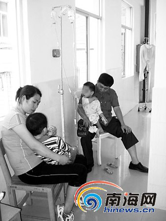 隨后,記者迅速驅(qū)車(chē)趕往五指山市采訪。在海南省第二人民醫(yī)院傳染科手足口病隔離區(qū)的病房里,記者見(jiàn)到了報(bào)料人王先生和他正在輸液治療的兒子。3歲的小王長(zhǎng)得十分可愛(ài),可是他的手掌上、腳上和口腔中卻長(zhǎng)出了不少膿點(diǎn)。