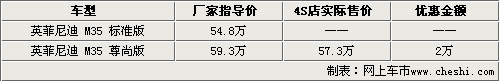 目前,英菲尼迪4S店內(nèi)老款M還有部分車型在銷售,09款M車型要到4月底才會(huì)到店,現(xiàn)已全面開始接受預(yù)定,訂金5萬元。銷售人員還表示,現(xiàn)在老款M35正在降價(jià)促銷,消費(fèi)者目前購車除了可以得到2萬元的現(xiàn)金優(yōu)惠外,還可以得到商家贈(zèng)送的原廠汽車裝飾,只是在車型顏色方面較少,主要以銀色車型為主。