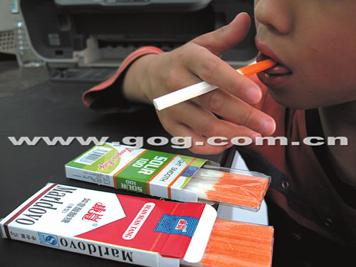 據(jù)家住安順市中華東路的劉女士講,他的兒子今年8歲,讀小學(xué)二年級(jí)。昨日上午,她看到兒子與三個(gè)小朋友在院子里玩時(shí),突然發(fā)現(xiàn)他們每人手里都夾了一支香煙,不停地送到嘴里。劉女士見(jiàn)了,氣得幾步走到兒子的身旁,正要伸手教訓(xùn)兒子時(shí),才發(fā)現(xiàn)這不是香煙,而是仿照香煙形狀的酸酸糖。兒子告訴劉女士,這些糖是他在附近的一個(gè)小攤子上用5角錢(qián)一包買(mǎi)來(lái)的,兒子還說(shuō),這種糖在他們學(xué)校附近也有賣(mài),因?yàn)橄裣銦,大家都覺(jué)得好玩,好多男同學(xué)都在買(mǎi),而且有的同學(xué)買(mǎi)來(lái)后,就像大人給別人敬煙一樣“敬”給關(guān)系好的同學(xué)“抽”。