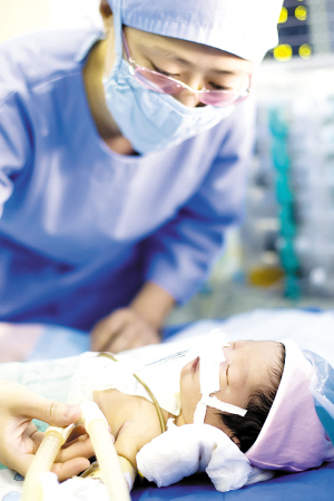 中秋節(jié)前添了個小寶貝,全家人都很高興。然而秋秋出生后沒多久,中心婦產(chǎn)科新生兒科的醫(yī)生們就發(fā)現(xiàn)孩子的嘴唇以及全身上下都開始發(fā)紫,而且越來越厲害。于是,中心婦產(chǎn)科醫(yī)院立即借助和胸科醫(yī)院的合作關(guān)系,請來胸科醫(yī)院的醫(yī)生為秋秋作B超檢查,發(fā)現(xiàn)秋秋屬于紫紺型先天性心臟病,原本應(yīng)該連接左心室的主動脈移位,必須盡快進行“修心”手術(shù),否則左心室便會萎縮、喪失正常功能,會有生命危險。這突如其來的打擊讓秋秋的父母痛不欲生,但小兩口仍然堅信自己的孩子一定能挺過這道難關(guān),他們無論如何也要給孩子看好病。