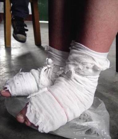 那個姐姐的死讓黃小紅開始特別注意清潔。每天早上,她都會先用消過毒、又浸滿氯化鈉生理鹽水的紗布將女兒一雙小腳裹起來,然后背著她,或用自行車載著她來到學校,再將冰袋放到女兒課桌下,讓她踩在冰袋上上課。中午回家后,又給她重新?lián)Q紗布。下午放學后,又給女兒雙腳消毒。