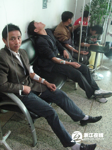 11月5日下午,記者在醫(yī)院急診中心看到,急診室的門口坐著5個(gè)臉色蒼白的男子,都無精打采地掛著吊瓶,其中一個(gè)年輕男子把臉埋在一個(gè)黃色的塑料袋里不停地嘔吐,身邊的男子不停地揉著他的背。