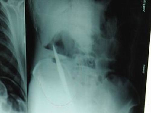 昨天(11月6日)上午,記者在徐州礦務集團總醫(yī)院重癥監(jiān)護室見到了這名男子,目前他雖然已經(jīng)恢復了意識,但還不能開口說話,需要呼吸機輔助呼吸。據(jù)醫(yī)生介紹,4日中午12時左右,這名男子因服毒輕生被緊急送到醫(yī)院進行搶救,之前,這名男子已經(jīng)在當?shù)剜l(xiāng)鎮(zhèn)醫(yī)院進行了近20小時的治療,但效果不佳。“病人被轉院到礦總院時已神志不清,血壓極低,處于休克狀態(tài)!本茸o人員給男子洗胃、初步處理以后,發(fā)現(xiàn)男子呼吸急促,于是趕緊給他拍片檢查。結果讓所有的醫(yī)生大吃一驚,竟有一把尖狀異物橫在該男子腹腔內(nèi)!當天下午5時30分,輕生男子被推上了手術臺。經(jīng)過40多分鐘的手術,該男子腹腔被打開,手術醫(yī)生發(fā)現(xiàn),男子體內(nèi)的金屬狀異物竟然是一把長19厘米的尖刀!