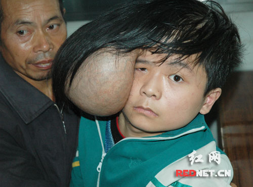 近日,湘雅醫(yī)院門診接診了一位特殊的患者,16歲的少年竟然長有兩個頭!這令接診的醫(yī)生非常驚奇,仔細一看,原來少年右腦旁長了一個和頭一樣大的東西,看上去就像一個裝滿水的大氣球,“氣球”上稀稀拉拉地長了一些頭發(fā),還能清楚地看到血管。日前,這名不幸的“雙頭”少年在湘雅醫(yī)院接受了腦室腹腔分流術(shù)和巨大皮下水瘤切除術(shù),成功卸掉了多余的“頭”,目前正在進一步的康復(fù)當中。該院神經(jīng)外科劉運生教授說,這樣的病例在臨床上非常罕見。