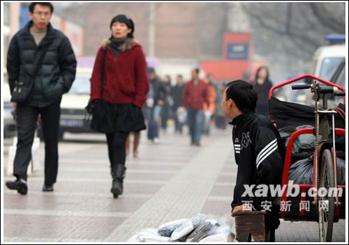 “襪子10塊錢4雙,大家來看看!弊蛉(12月18日)下午3時(shí)許,在東大街上,尋常的叫賣聲中,一個(gè)小販坐在小木凳上,身著破舊的運(yùn)動(dòng)服,面前是一個(gè)小地?cái),放著各色各樣的新襪子。他的身體倚著一輛手搖車,面帶微笑地望著過往行人。