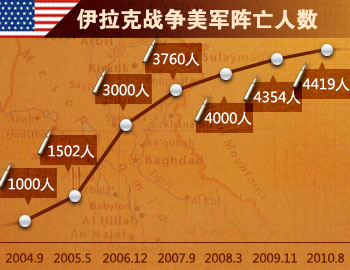 在攻打伊拉克的大規(guī)模軍事行動(dòng)中,美軍只有138名軍人喪生。但此后美軍頻繁遭到伊拉克境內(nèi)反美武裝的襲擊,傷亡人數(shù)不斷攀升。截至2010年8月16日,駐伊美軍死亡總數(shù)已達(dá)4415人,另有約3.2萬(wàn)人在戰(zhàn)斗中受傷。龐大的軍費(fèi)開支也給美國(guó)經(jīng)濟(jì)造成沉重負(fù)擔(dān)。截至2010年8月19日,美國(guó)用于伊戰(zhàn)的開支已達(dá)7423億美元,平均每天耗費(fèi)2.75億美元。
