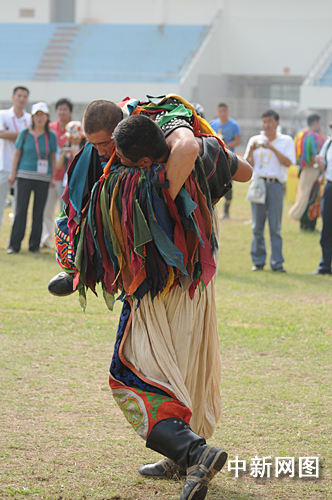 中新網(wǎng)泉州10月31日電 (劉通)今天上午,第六屆全國農(nóng)民運(yùn)動會在福建泉州繼續(xù)進(jìn)行!安恕(蒙古族摔跤)雖是本屆農(nóng)運(yùn)會中國式摔跤比賽中的一個小項(xiàng),但卻極富觀賞性和趣味性。無論服飾、入場儀式還是比賽規(guī)則都帶有獨(dú)特鮮明的民族色彩。