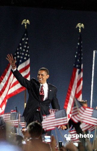 圖為奧巴馬當(dāng)晚在芝加哥出席慶祝晚會上以“美國的變革”為主題發(fā)表獲勝演說,稱“美國的變革時代已到來”。