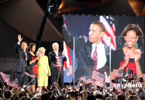 圖為奧巴馬夫婦和拜登當(dāng)晚在芝加哥慶祝勝利。中新社發(fā) 李靜 攝