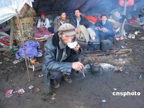 圖為十一月六日,被緊急安置的村民們?cè)诰葹?zāi)帳篷前吃早飯。中新社發(fā) 保旭 攝