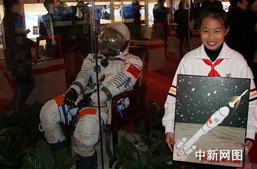 少先隊(duì)員與“神七”航天員翟志剛所穿航天服合影。孫自法 攝