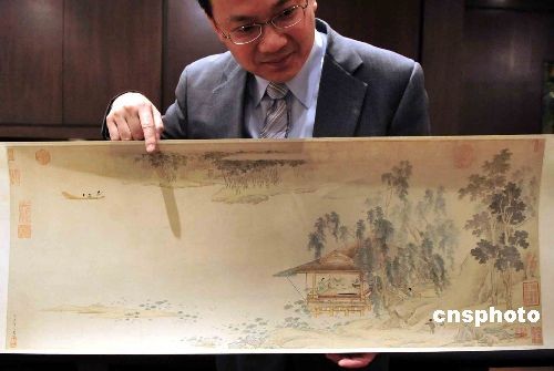 圖為預(yù)料成交價(jià)超過一千二百萬港元的仇英名作《采蓮圖》,這幅精美的手卷曾被清朝乾隆皇帝收藏。中新社發(fā) 譚達(dá)明 攝