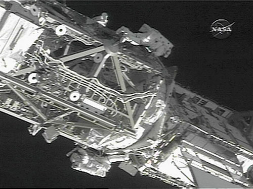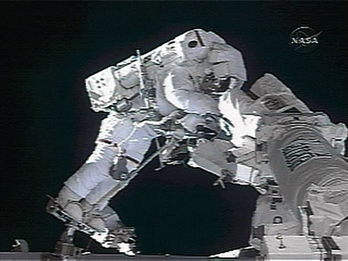 在長(zhǎng)達(dá)6小時(shí)45分鐘的太空行走中,“奮進(jìn)”號(hào)任務(wù)專家海德瑪麗·斯特凡尼斯海寧-皮珀和沙恩·金布羅繼續(xù)維修空間站外右側(cè)出故障的太陽(yáng)能電池板旋轉(zhuǎn)接頭。