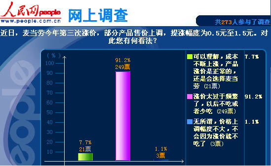 2008年10月初,麥當(dāng)勞在一年內(nèi)第三次宣布漲價(jià),部分產(chǎn)品售價(jià)上調(diào),提漲幅度為0.5元至1.5元。對(duì)此,人民網(wǎng)做了網(wǎng)上調(diào)查,共有273人參與。