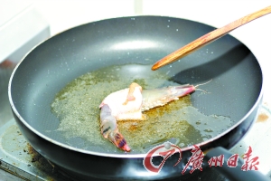 3. 放較多的油,油熱后把撈過香炸生粉的“翅蝦”放在鍋中炸至黃金色,時間約10分鐘。
