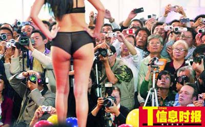 情趣內(nèi)衣秀在性文化節(jié)會(huì)場中“人氣”最旺,不少觀眾占據(jù)有利地形一飽眼福