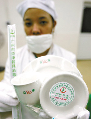 相關(guān)部門表示,將研究制定《廣州市餐飲業(yè)使用集中洗消餐具衛(wèi)生要求》和《廣州市餐具集中洗消衛(wèi)生規(guī)范》,在目前尚未有針對餐具集中消毒企業(yè)的相關(guān)法律法規(guī)出臺前,將加大監(jiān)督抽檢力度,嚴(yán)厲查處使用不合格餐具的餐飲單位。