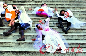 11月20日,一群女子在羅馬一廣場(chǎng)穿著帶血點(diǎn)的結(jié)婚禮服抗議家庭暴力。