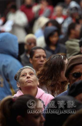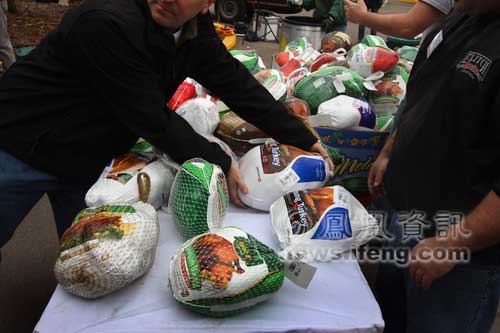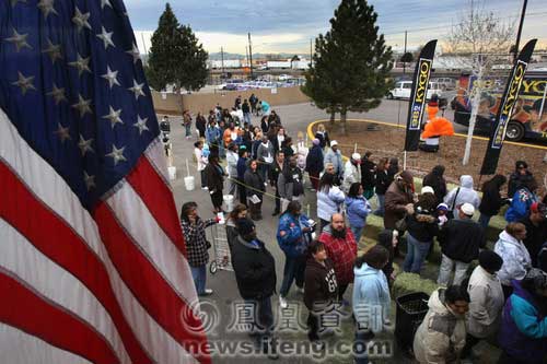 2008年11月25日,美國(guó)科羅拉多州丹佛市,人們?cè)诤L(fēng)中排隊(duì)等待領(lǐng)取感恩節(jié)的免費(fèi)火雞和其他食物。丹佛市的慈善機(jī)構(gòu)計(jì)劃在感恩節(jié)之前向大約1200戶有需要的困難家庭發(fā)放感恩節(jié)食物。