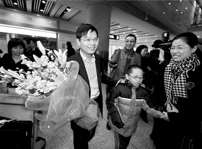 昨日,從泰國(guó)返回北京的中國(guó)公民黃忠(左二)走出機(jī)場(chǎng)