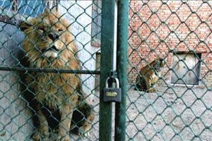 一個(gè)月前,動(dòng)物園的工作人員將4歲多的公獅胖子換到這個(gè)獸舍代替奧肥。或許因?yàn)橄肽願(yuàn)W肥,同同對(duì)這個(gè)新來(lái)的“第三者”十分逃避。胖子體形大,讓尚未和它熟識(shí)的同同害怕不已。而同樣未接觸過(guò)老虎的胖子,也對(duì)同同心生恐懼。在最初的幾天,它們各自躲在自己的獸舍里發(fā)出嘶叫,不敢越雷池一步。放在一起后,它們還曾經(jīng)互相抓撓對(duì)方,直到最近它們倆才開始熟悉。