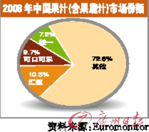 據(jù)國(guó)際研究公司Euromonitor給本報(bào)提供的統(tǒng)計(jì),去年中國(guó)果汁(含果蔬汁)市場(chǎng)份額中,統(tǒng)一排名僅次于匯源和可口可樂,以7.2%名列第三位。